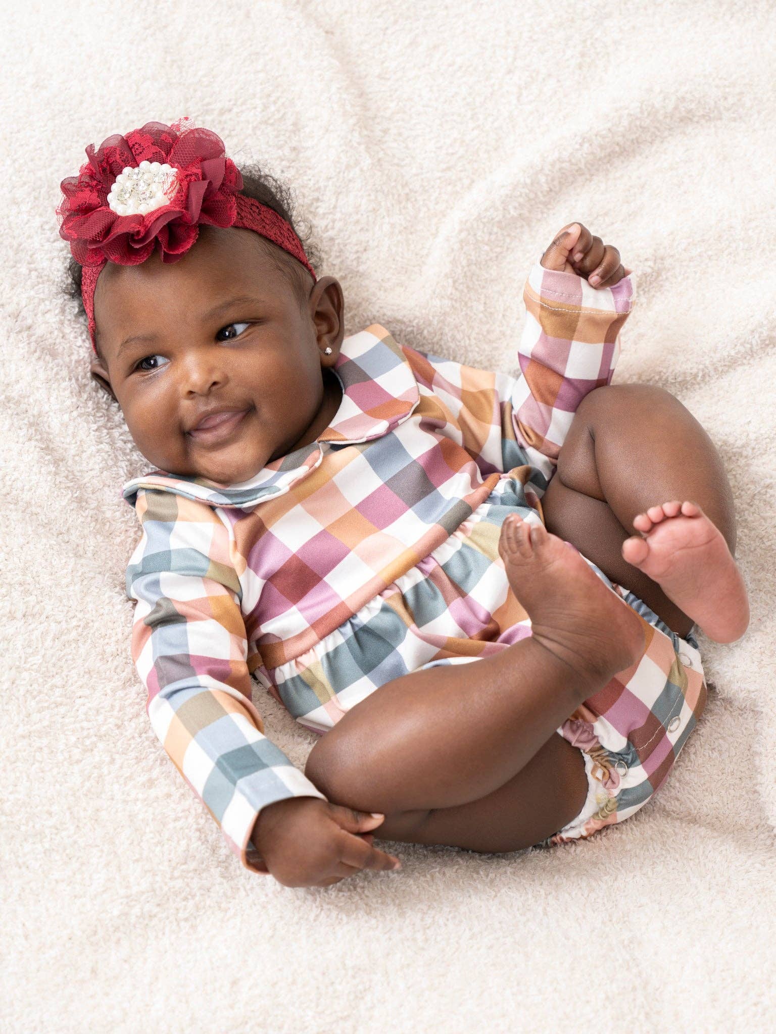 Everyone's fave is back with a new variation! The best fall set for siblings, cousins, or even best friends! This fall plaid bubble features a Peter pan collar, a cinched waist, and elastic leg openings. * Fits true to size. * 95% Polyester / 5% Spandex * Accessories sold separately. * Import. Essence is 23 inches long and 13 lbs wearing size 3-6 months.